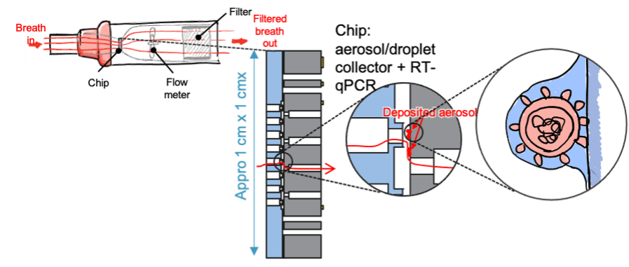 Illustration of DNA capture from aerosols through a microfluidic chip, for instance in a device for breath analysis.