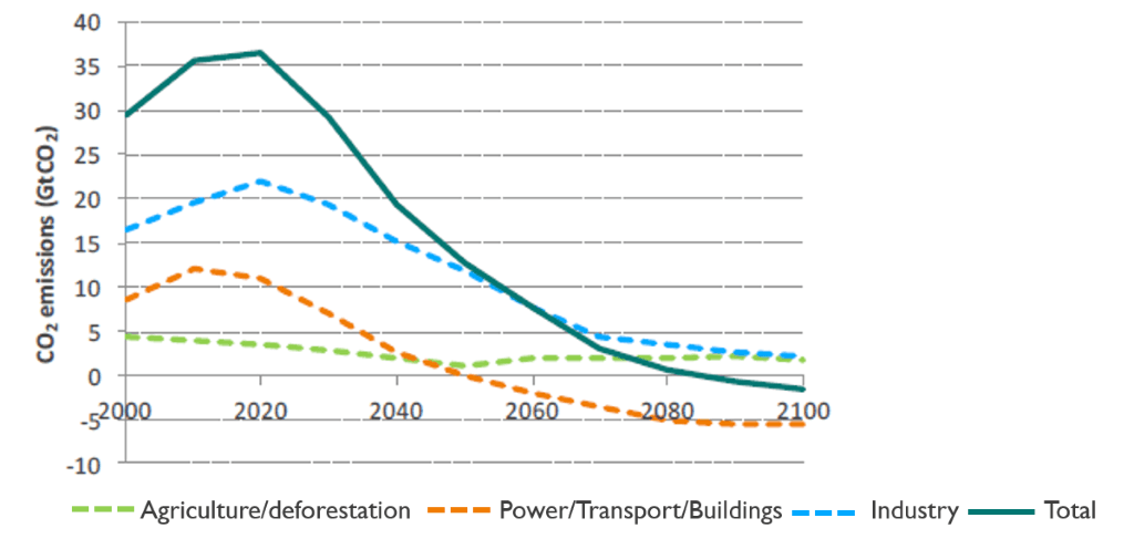 Based on IPCC predictions, carbon emissions in industry and agriculture will decrease slower than in power and transport.