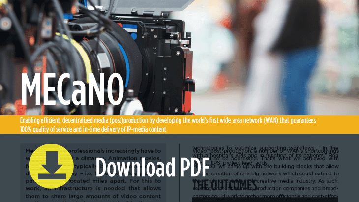 "In order to have media companies switch to more cost-effective IP-based WAN approaches to support decentralized video (post)production, a number of WAN’s shortcomings needed to be addressed. That’s what we achieved with MECaNO: we came up with the building blocks that allow for the creation of one big network which could extend to the whole of the Flemish creative media industry. As such, existing content owners, production companies and broadcasters could work together more efficiently and cost-effectively, while new players could more easily find new collaboration opportunities – thus fostering the whole industry’s further growth. " says Luc Andries, CTO of SDNsquare, and MECaNO’s project lead.