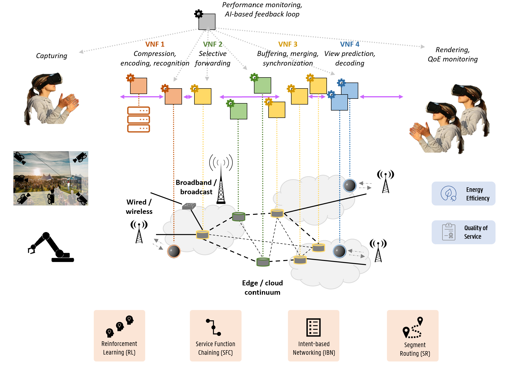 Applications that rely on remote communication, collaboration and sensing are becoming more and more distributed over large networks and are demanding increasing amounts of computational and networking resources. Next-generation services in eHealth, immersive telepresence, automotive, retail and industry all deal with ultra-low latency and high-throughput requirements that cannot be met by monolithic deployments. Such applications are instantiated as Service Function Chains (SFC), involving multiple multi-tenant components that are often AI-based themselves.