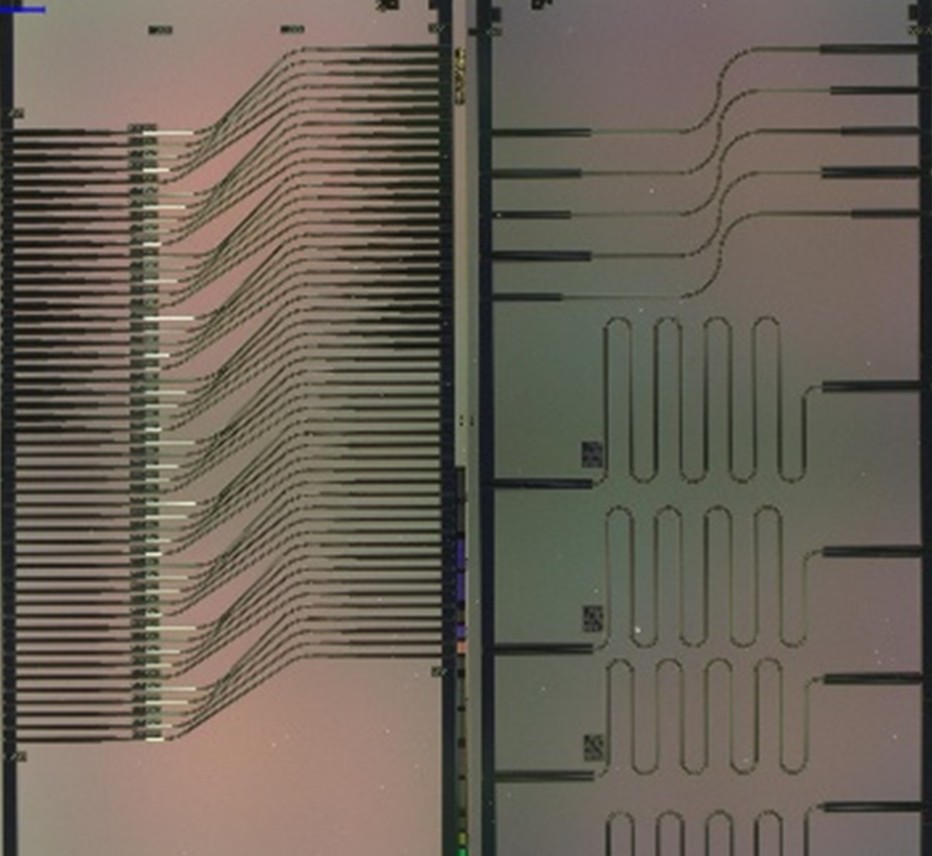 At imec, we are developing mid-IR integrated photonics through the development of germanium–silicon (GeSi) wafers tailored for advanced sensing applications. Our initial fabrication run has produced wafers with essential photonic building blocks (right plot), e.g., edge couplers, waveguide spirals, and ring resonators, alongside test structures for assessing coupling efficiency, propagation loss, and platform performance. To support this effort, we have established a free-space optical test bench featuring a tunable mid-IR laser source (8–11 µm), alignment stages, and lock-in IR detection for high-sensitivity measurements.