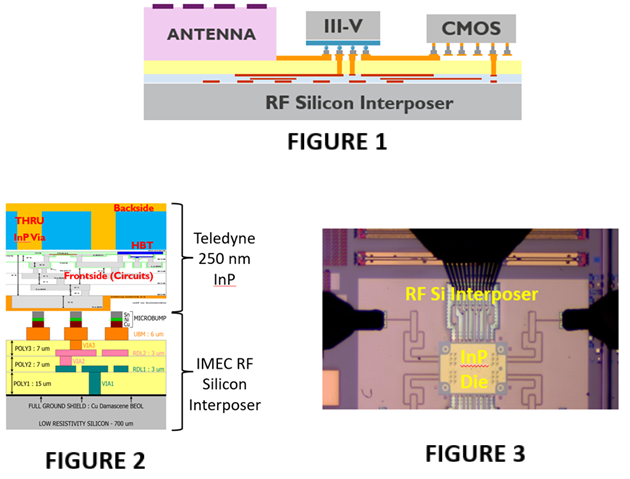In 2024, we assembled an InP Power Amplifier at D-band (110-170 GHz) on this Interposer technology which was the first demonstration of an amplifier above 100 GHz on a Silicon Interposer (FIGURES 2 and 3). These transistors from Teledyne have ft and fmax of 350 and 650 GHz respectively making them better than their silicon counterparts for Sub-THz power generation and amplification. This work showed that it is possible to combine the best of both worlds – high performance III-V transistors with Waferscale Silicon packages.