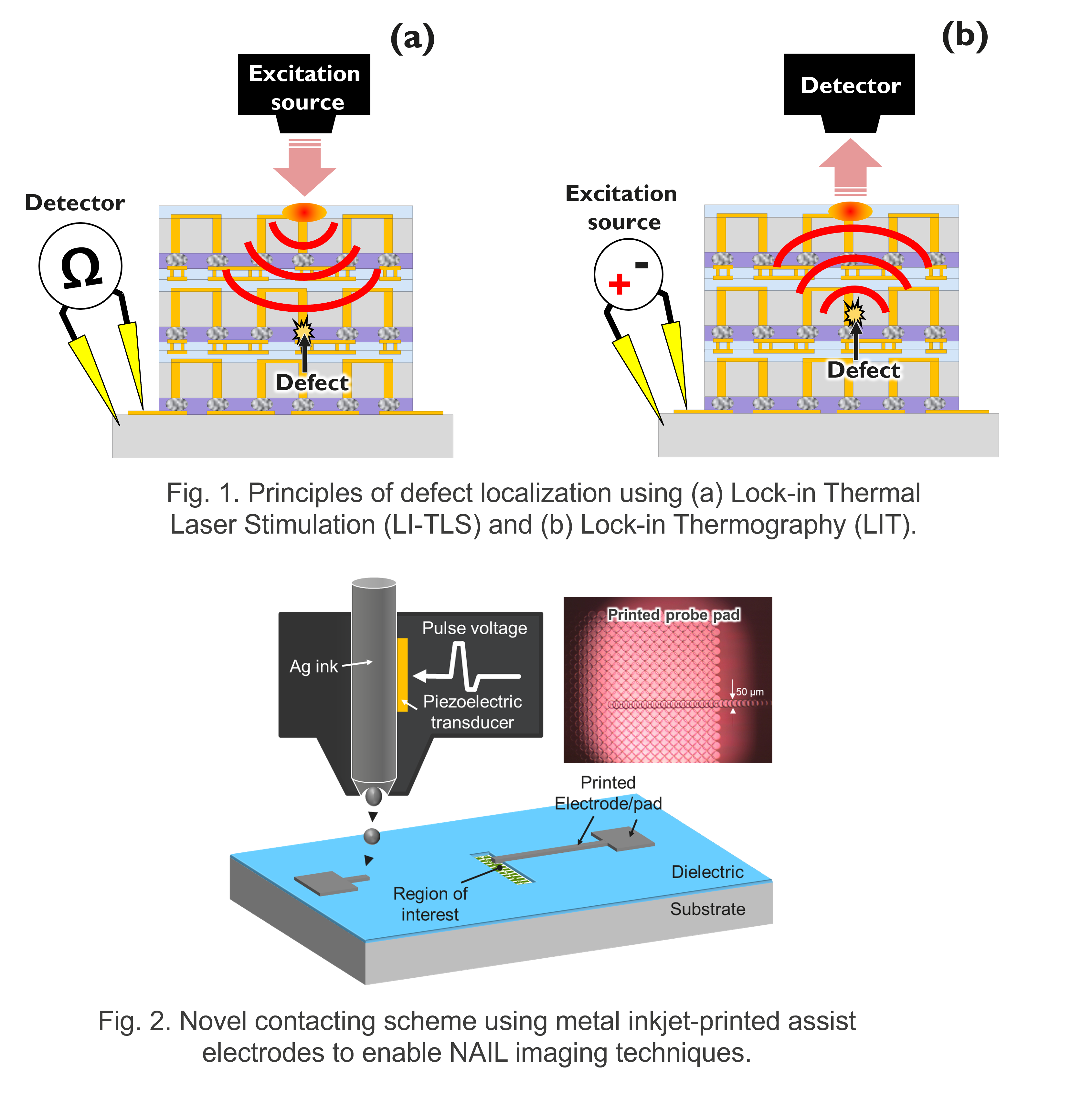 In this context, thermal-based techniques merge as a practical solution for accessing fault information in regions beyond the reach of optical methods. At imec, a novel lock-in thermal laser stimulation (LI-TLS, Fig. 1(a)) technique has recently been introduced [2], enabling localized thermal excitation and detection of fault signatures even in optically inaccessible regions. In parallel, an enhanced lock-in thermography (LIT, Fig.1 (b)) method has also been developed [3], offering improved sensitivity and spatial resolution. To enable the effective use of these techniques, new sample preparation methodologies will need to be investigated and developed. For example, metal inkjet printing of redistribution layers (Fig. 2), may enable the use of numerical aperture increasing lens (NAIL) techniques improving thermal imaging access and resolution [4].