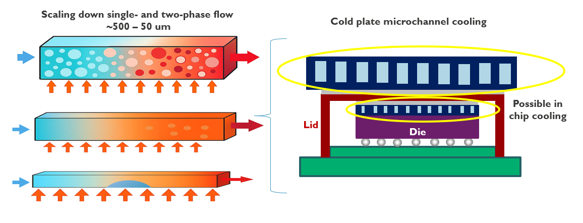 The proposed PhD thus seeks to explore potential means – active or passive, single phase/two-phase or a combination of both, for very small-scale systems. The high-power levels at such small scales imply high heat fluxes (200 – 1000 W/cm2) following which it is inevitable to expect phase change. The proposed work thus seeks to understand the dynamics of phase change and the relevant phenomena – bubble dynamics, bubble growth, dry out, etc, as governed by various geometrical and heating parameters. At such small scale, interface phenomena such as capillary phenomenon, Marangoni convection would play an important role. How much positive impact they can have needs to be investigated. Further, can some surface modifications such as surface wettability be used to tune the desired performance. The proposed study further seeks to investigate this behavior not restricted to pure fluids but also binary fluid mixtures where the presence of mass transfer can further augment the local advection and thus heat transfer. The proposed system configuration includes simple microchannels and would be extended to stacked configuration to analyze the impact of conjugate heat transfer as well as contact angle dynamics. While addressing the above-mentioned fundamental questions, the technological implications would lie to push the limits of power that can be applied, through appropriate system design in terms of fluidic network. Initial investigations would pertain to current scale micro-scale systems with objective to see possibility of having hybrid cooling – both single and two-phase to seek advantages of both and eventually looking into the feasibility of miniaturizing this system.