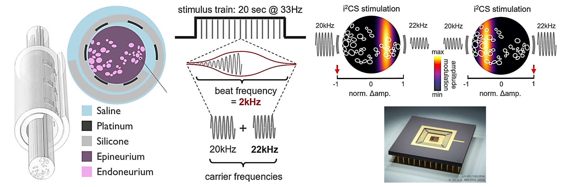 Intermittent interferential current stimulation is a promising and recent neuromodulation technology that enables non-invasive electronic spatial steering towards both deep and superficial targets in nerve tissue. In the peripheral nervous system, this allows to selectively target specific fascicles associated with specific organs and functions. Recently, imec demonstrated that intermittent interferential current stimulation (i2CS) is able to entrain small bronchopulmonary-specific fascicles with high temporal resolution, while avoiding undesired co-stimulation of larger laryngeal muscle fascicles (Rossetti et al. (2025)) (attached figure). Here, activation of the bronchopulmonary branch has beneficial effects on modulating the breathing rate, while undesired stimulation of laryngeal fascicles is related to side-effects, such as hoarseness and cough.