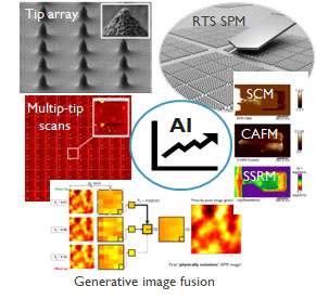 Therefore, in this PhD project these challenges are addressed by exploiting the unique features of the recently established reverse tip sample (RTS) scanning probe microscopy (SPM), where the sample is mounted on the cantilever, allowing for fast and easy tip switching along with consistent force application between the tips. Custom hardware will be designed and prototyped and elaborated automation routines will be established to efficiently collect large datasets across various electrical modes and tips. To enable and facilitate the mixing and correlation of the collected signals, advanced computational techniques such as AI-driven data fusion and cross-correlation on a pixel-by-pixel basis are going to be explored for extracting deeper insights from multimodal datasets. Furthermore, the precise control of instrument noise is studied for achieving true signal mixing, and the interpretation of multidimensional statistical data is explored. The final targeted outcome of this PhD research is the establishment of powerful AFM platforms that offer seamless, real-time multi-modal electrical signal acquisition, enhanced by intelligent algorithms that both optimize data collection and analyze the results. These algorithms could help to remove tip-related artifacts from the signal, revealing previously hidden correlations or emergent behaviors. The ability to obtain a comprehensive electrical perspective, unconstrained by tip shape or size, will be a crucial enabler to adequately characterize next-generation nanoelectronics devices which continue to shrink and grow more complex.